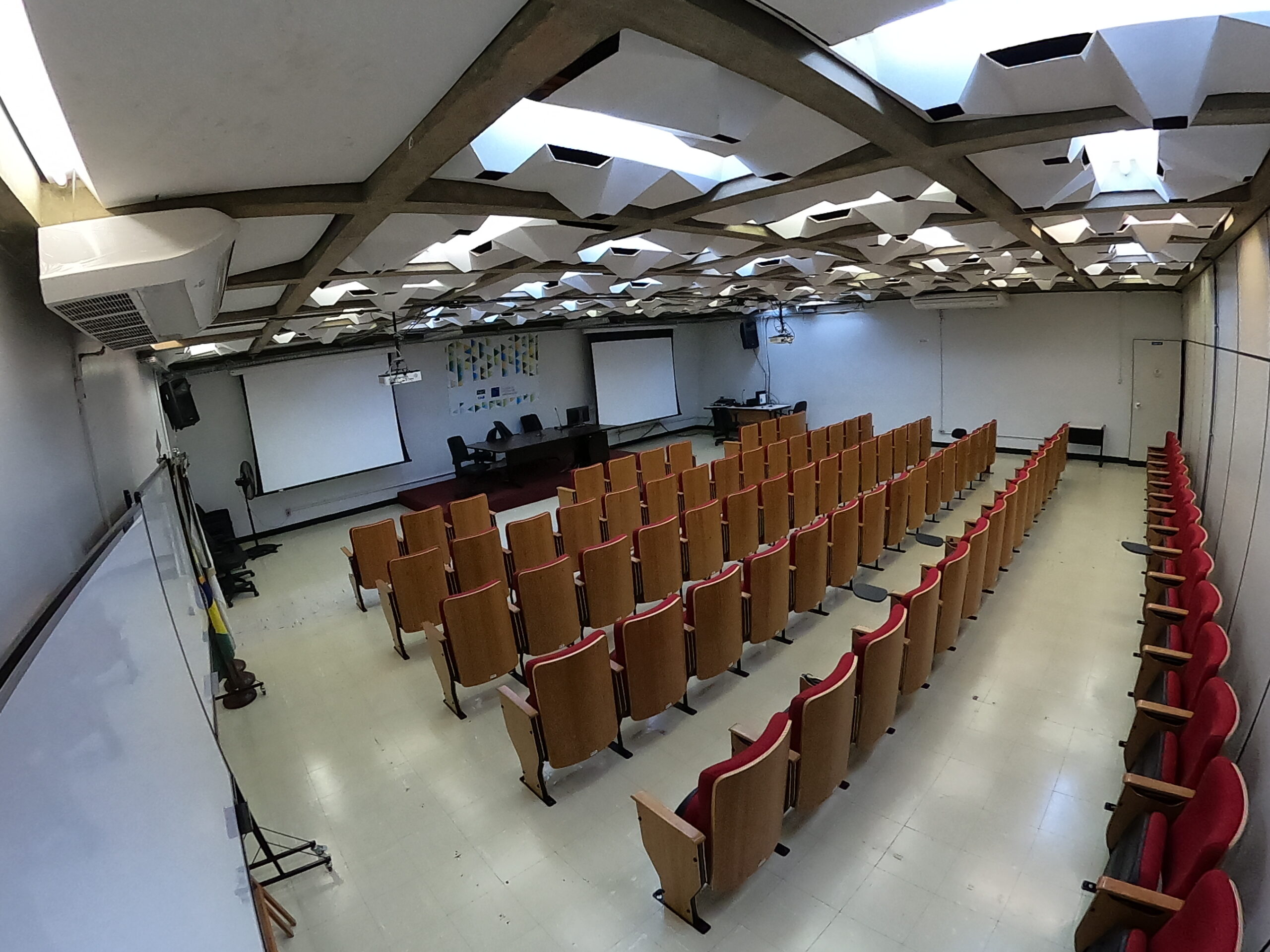 Com capacidade para 70 pessoas, o auditório oferece infraestrutura completa para eventos, palestras e apresentações. Conta com dois projetores, duas telas de projeção, sistema de som com mesa de som, microfones de mesa, desktop e câmera para vídeo-conferência, garantindo qualidade audiovisual e conectividade para diferentes formatos de eventos.