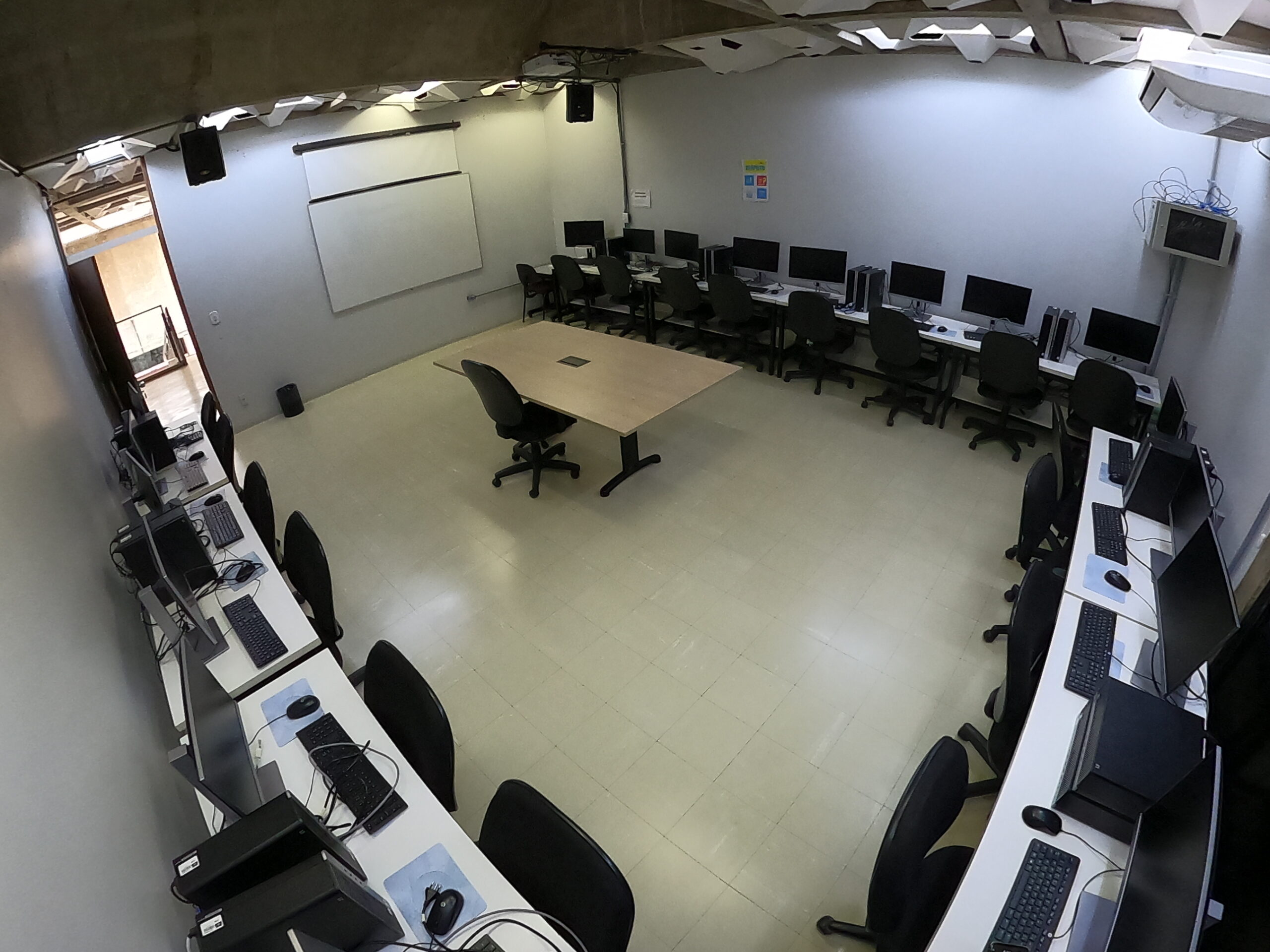 Espaço compartilhado entre os cursos de Biblioteconomia, Arquivologia e Museologia, o laboratório possui capacidade para 30 alunos e é voltado ao desenvolvimento de atividades acadêmicas, como reuniões, oficinas e trabalhos em grupo. O ambiente conta com 3 mesas de reunião, televisor de 85 polegadas e desktop, proporcionando uma estrutura adequada para apresentações, discussões e projetos colaborativos.