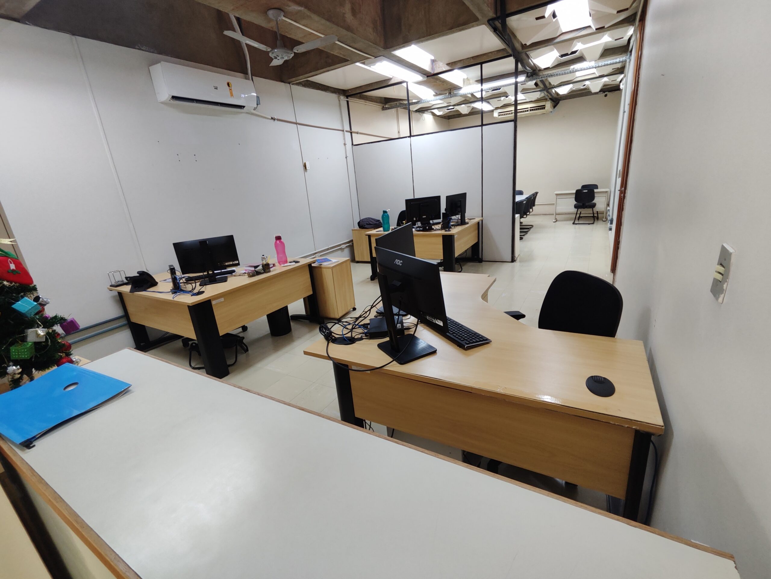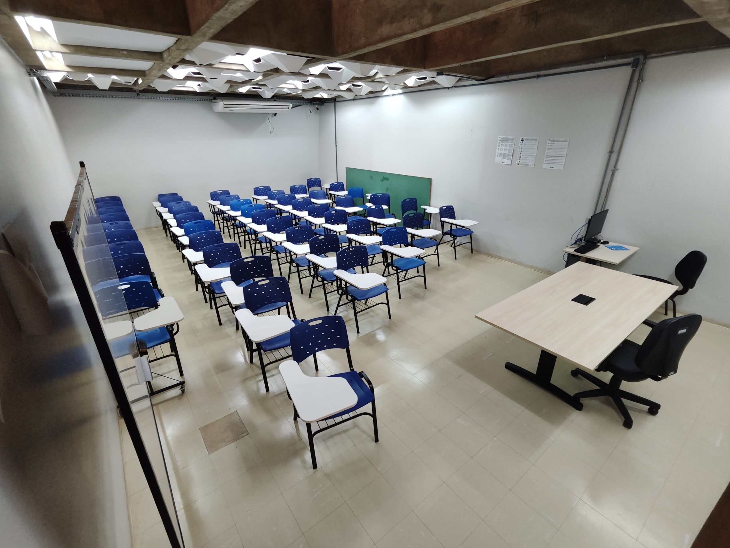 Salas de Aulas com capacidade para até 40 alunos, equipada para aulas regulares. Conta com TV de 75 polegadas e computador desktop, oferecendo suporte adequado para atividades didáticas presenciais.