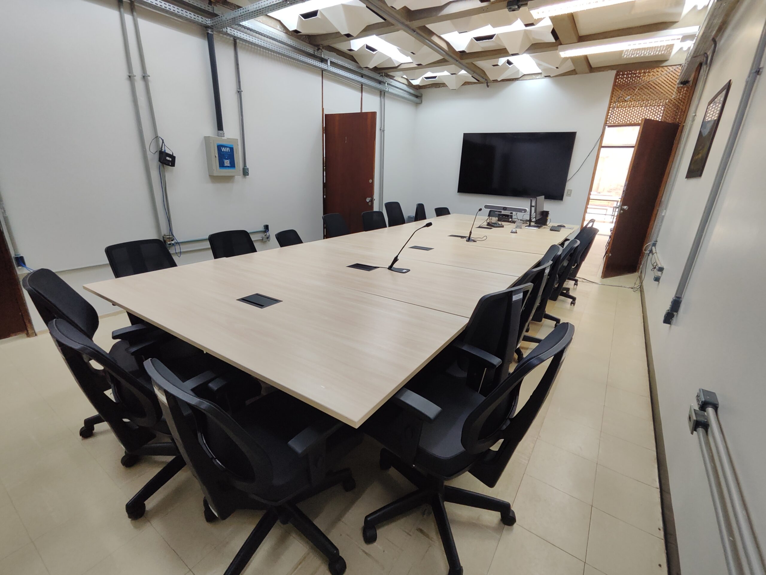 Com capacidade para até 20 pessoas, a Sala de Reuniões da FCI é equipada para encontros presenciais e virtuais de alta qualidade. O espaço conta com televisor de 85 polegadas, desktop, câmera de vídeo-conferência e microfones de mesa, oferecendo infraestrutura adequada para reuniões administrativas, acadêmicas e defesas em ambiente colaborativo e tecnológico.